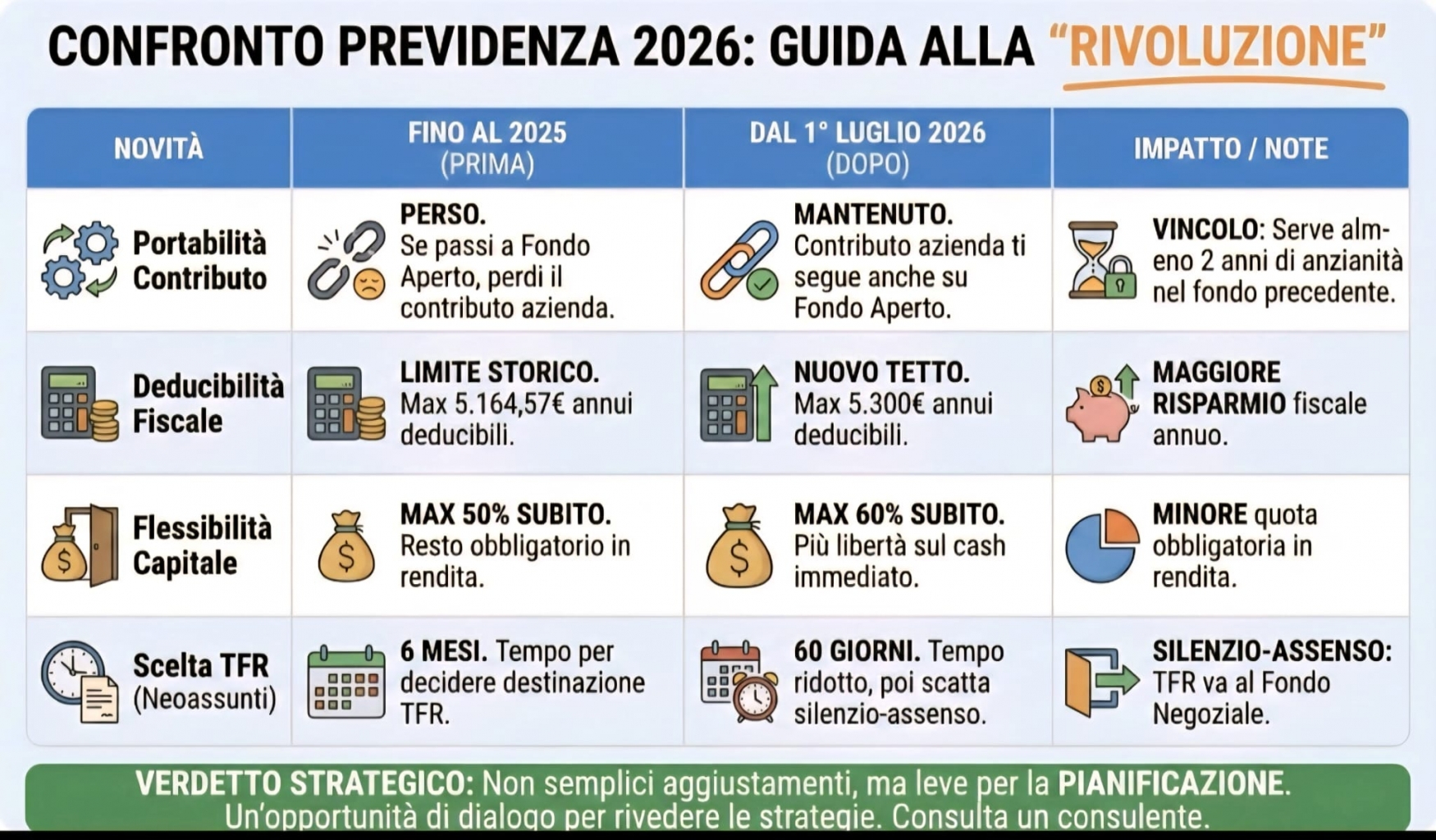 Tirando le somme, la riforma 2026 spinge con decisione in tre direzioni: più incentivo fiscale, meno inerzia nelle scelte sul TFR e maggiore flessibilità al momento della pensione. La previdenza complementare viene trattata sempre meno come un’opzione marginale e sempre più come una componente strutturale del percorso previdenziale.